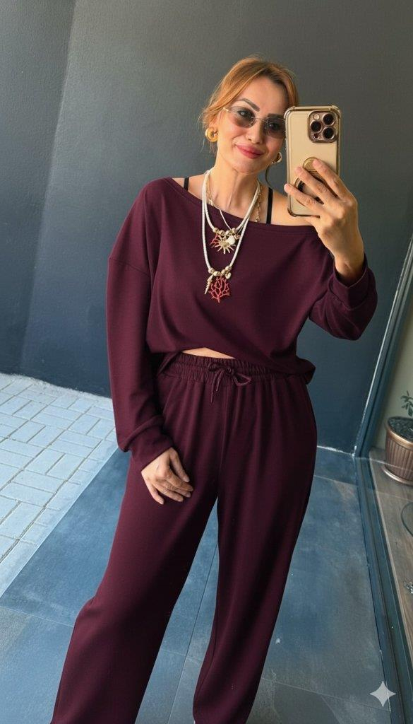 Kadın Uzun Kollu Tek Omuzdan Açık Viskon Iki Iplik Bluz Ve Pantolon Ikili Takım